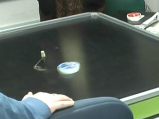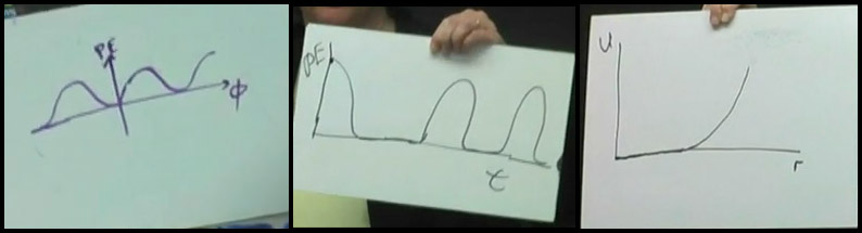Students begin this activity by observing the motion of the puck on the airtable. The puck is pushed so that it passes close to, but does not strike, the pin in the center of the table. Students are asked to observe the motion of the puck. Then students are asked to respond, “On your small white board, make a plot of the potential energy.” Don't give a more precise prompt.