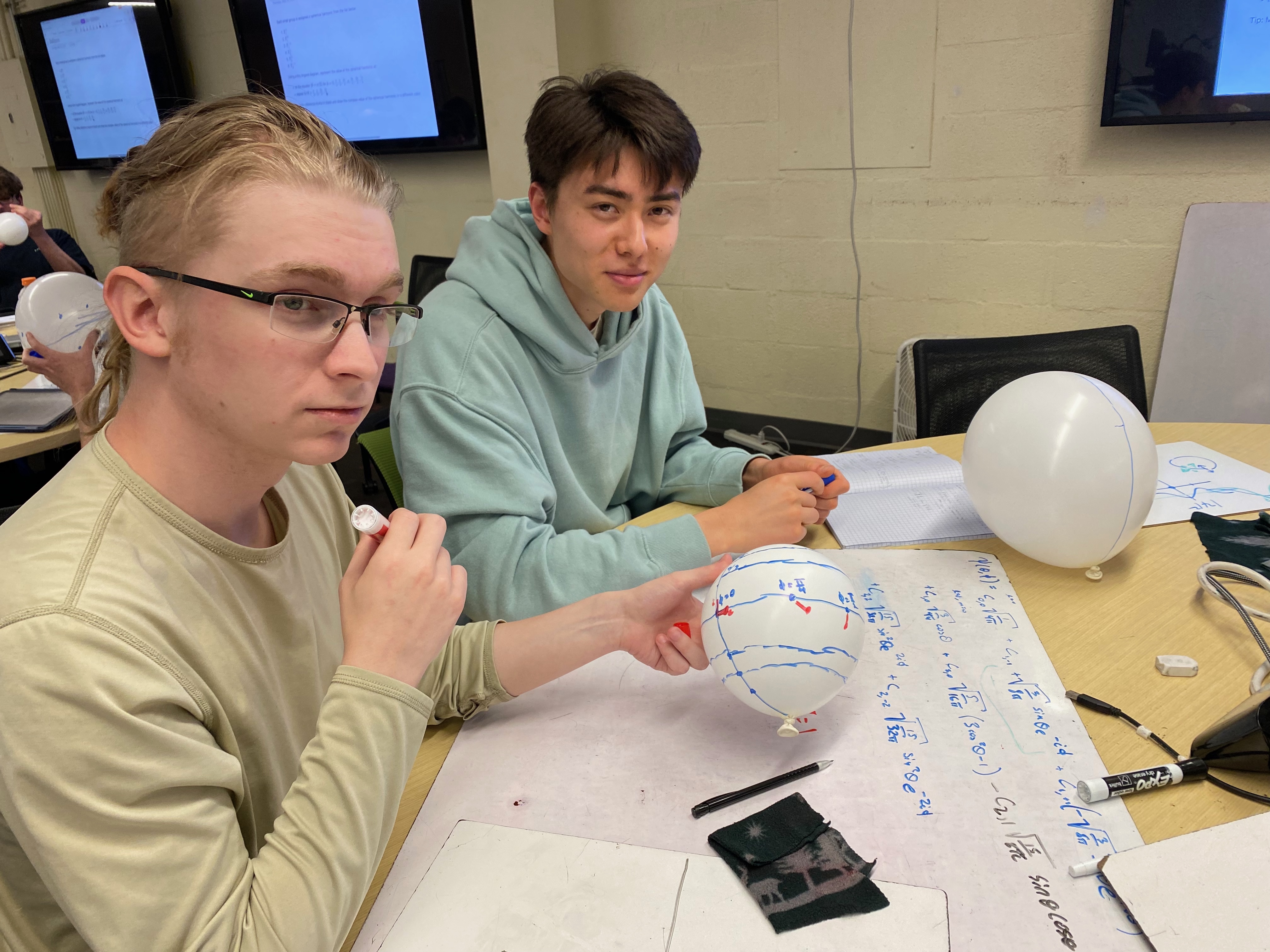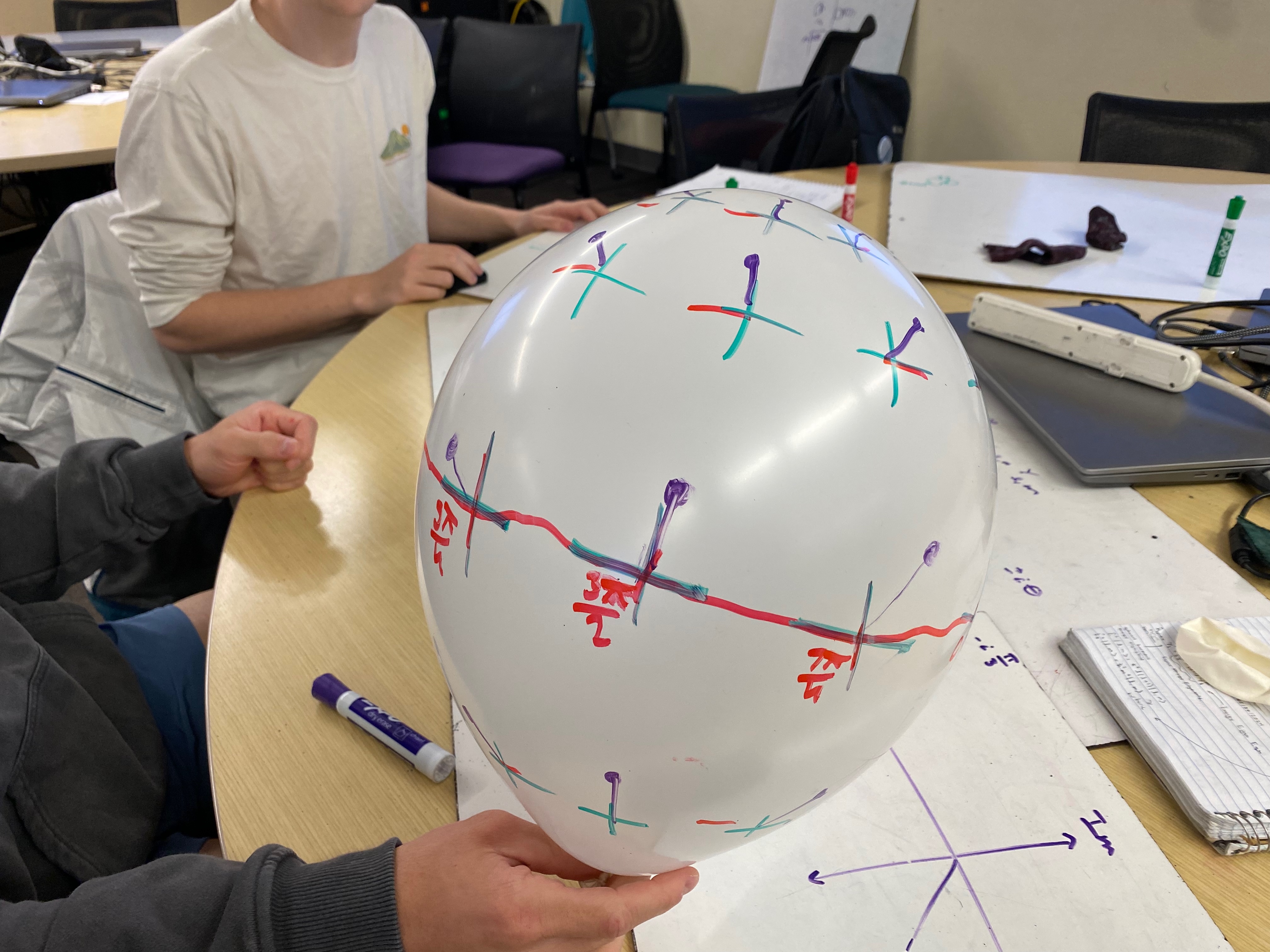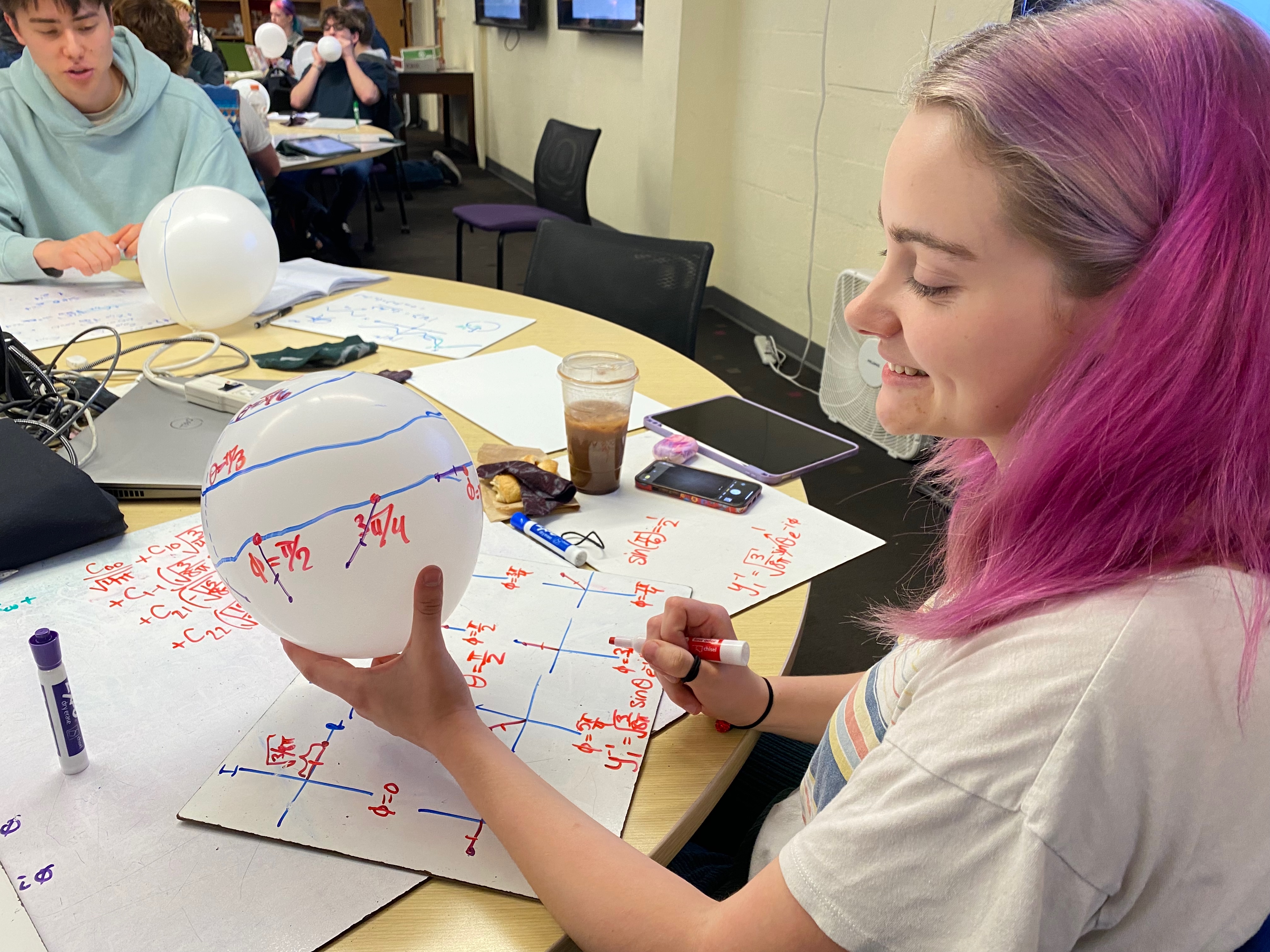 Students set up a spherical coordinate system on a balloon, draw a spherical harmonic, and use the balloon as a prop to describe the main features of their spherical harmonic to the class.