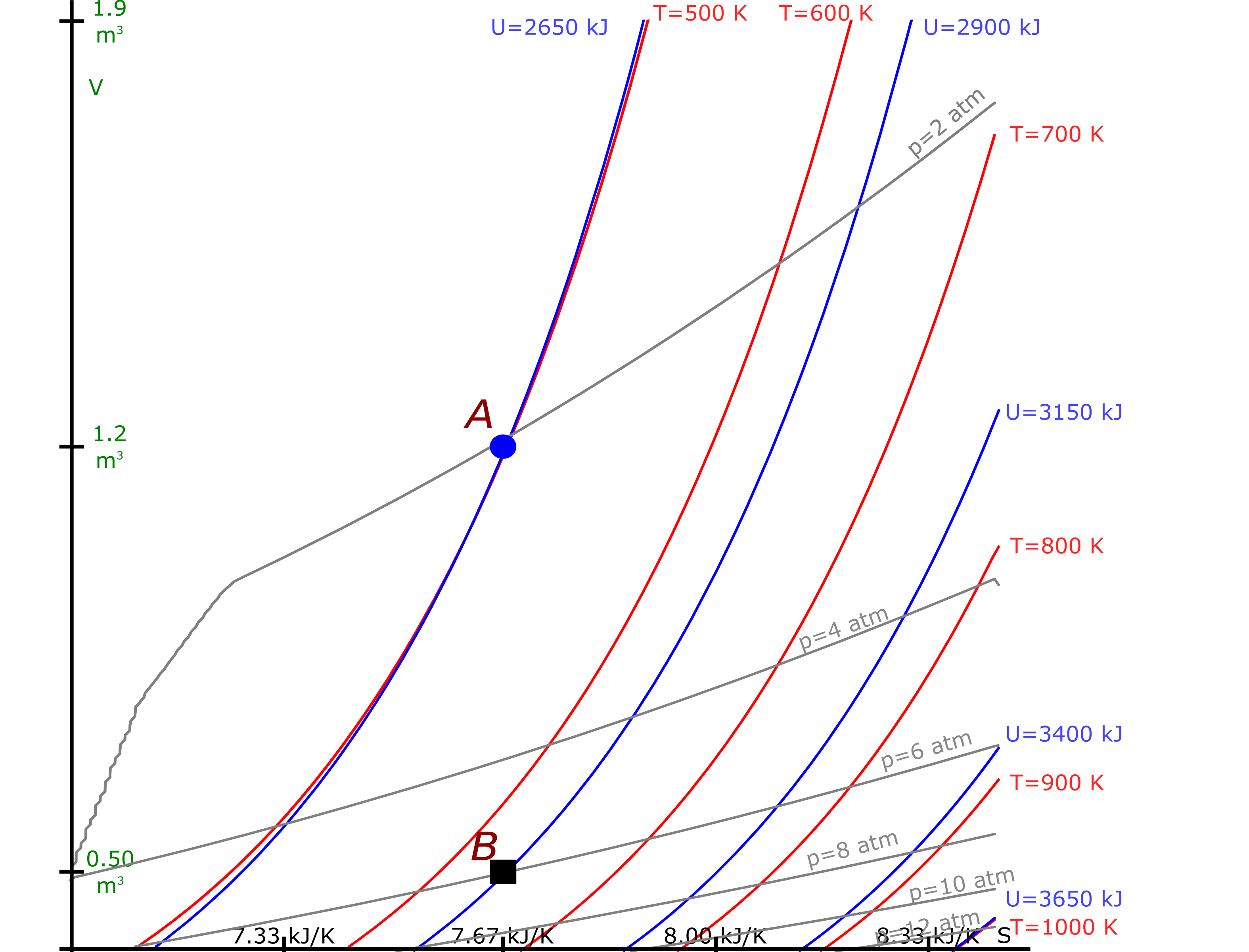 Follow-up: How would you represent this derivative symbolically? Some students write \(\Delta U / \Delta T\) vs. \(dU/dT\); some students write subscript \(S\) vs. \(A \rightarrow B\). A good opportunity to talk about how the derivative ought to depend on the value of \(S\).