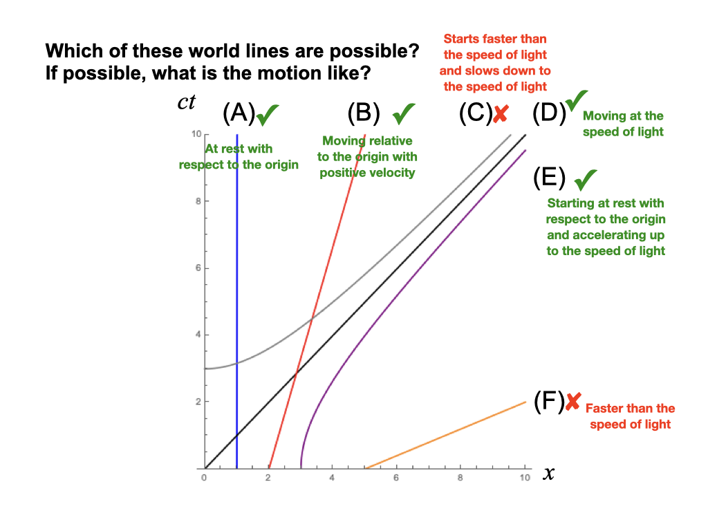 Student consider several curves on a spacetime diagram and have to judge which curves could be worldlines for an object.