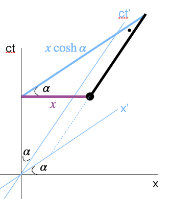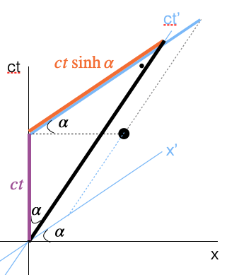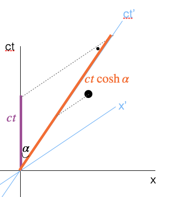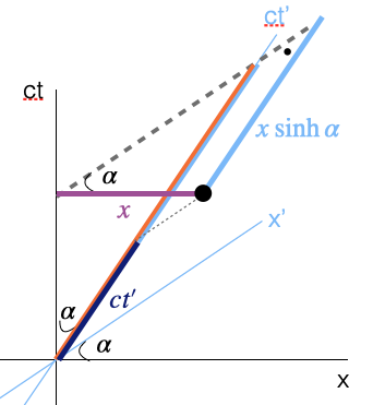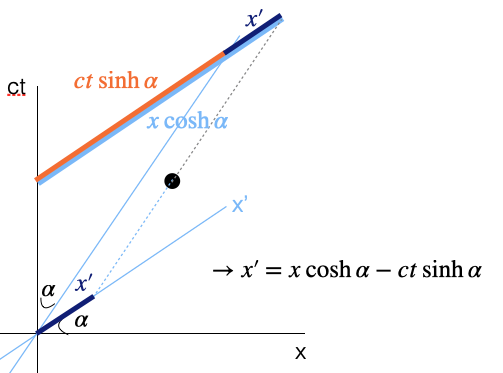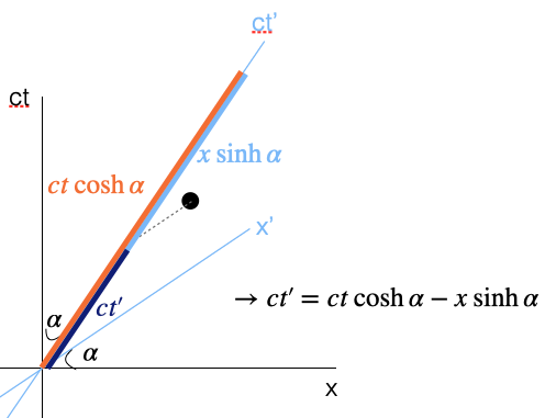 Here is a geometric derivation of the Lorentz Transformation using hyperbola geometry: \begin{align*} \left[\begin{array}{c} x'\\ ct' \end{array}\right] = \left[\begin{array}{c c} \cosh\alpha & -\sinh\alpha\\ -\sinh\alpha & \cosh\alpha \end{array}\right] \left[\begin{array}{c} x\\ ct \end{array}\right] \end{align*}