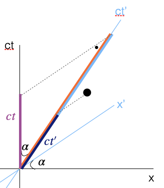 On the spacetime diagrams, the large black dot is the event we're trying to describe. The small black dot indicates a right angle for a hyperbolic triangle.