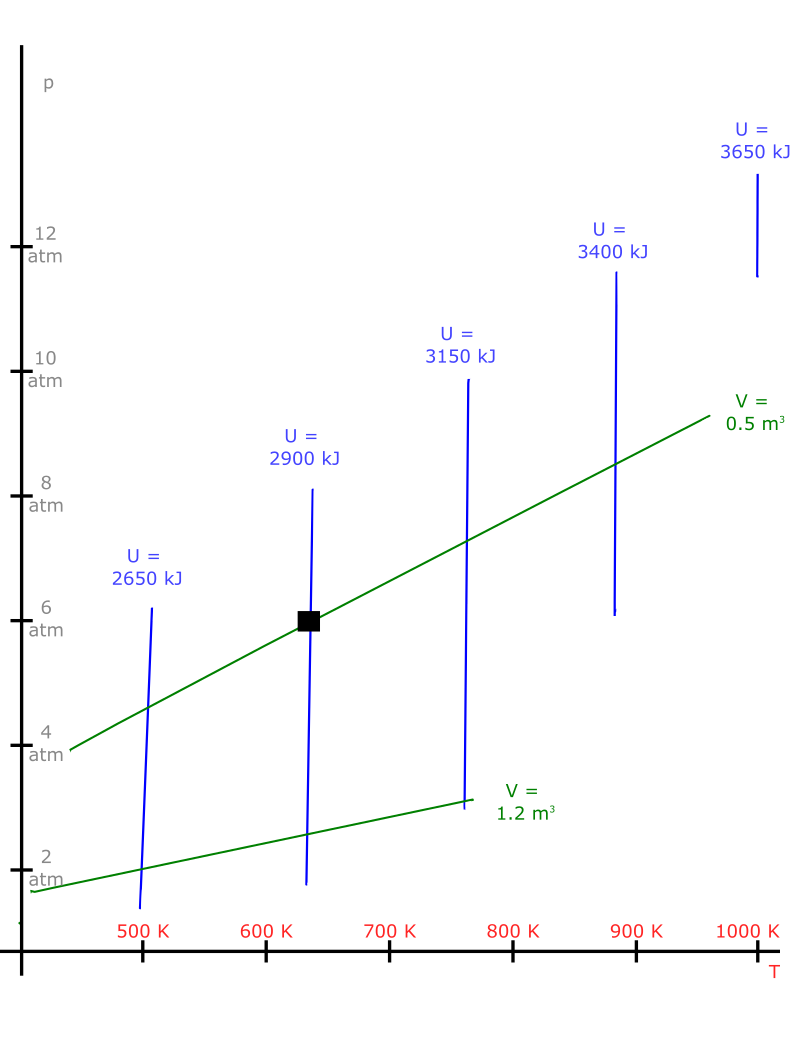 The graph provided by your instructor shows internal energy and volume contours plotted on temperature and pressure axes.
