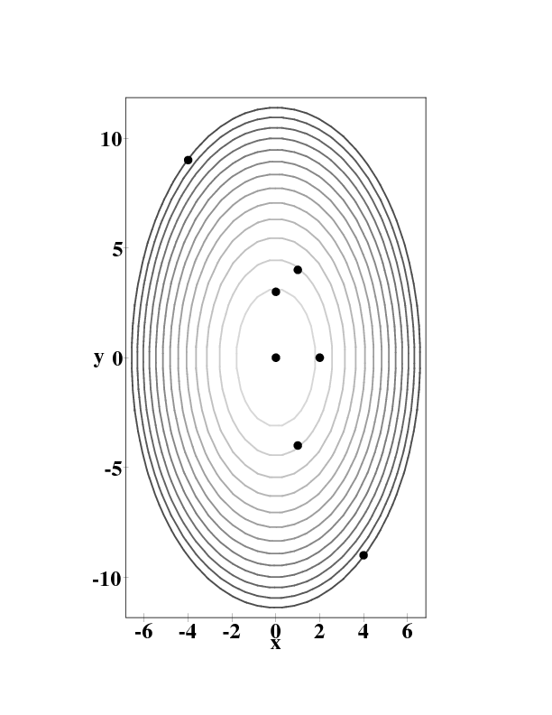A: \((1,4)\qquad\) B: \((4,-9)\qquad\) C: \((-4,9)\qquad\) D: \((1,-4)\qquad\) E: \((2,0)\qquad\) F: \((0,3)\)Your guidebook tells you that the height \(h\) of the hill in feet above sea level is given by \[h = a - b x^2 - c y^2\] where \(a=5000\hbox{ft}\), \(b=30\,{\hbox{ft}\over\hbox{mi}^2}\), and \(c=10\,{\hbox{ft}\over\hbox{mi}^2}\).