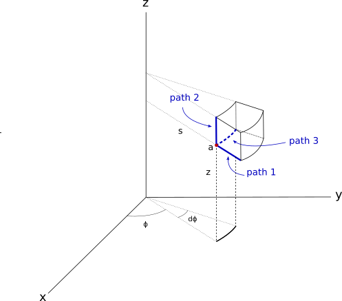 Using the first figure below, determine the length \(d\ell\) of each of the three paths shown (the three thick lines). Notice that, along any of these three paths, only one coordinate \(s\), \(\phi\), or \(z\) is changing at a time (i.e. along path 1, \(dz\ne0\), but \(d\phi=0\) and \(ds=0\)).