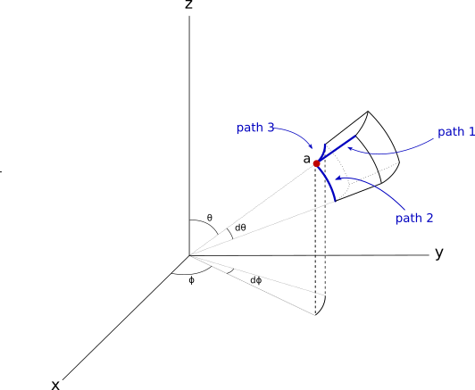 Using the second figure below, determine the length \(d\ell\) of each of the three paths shown (the three thick lines). Notice that, along any of these three paths, only one coordinate \(r\), \(\theta\), or \(\phi\) is changing at a time (i.e. along path 1, \(d\theta\ne0\), but \(dr=0\) and \(d\phi=0\)).(Be careful: One path is trickier than the others.)