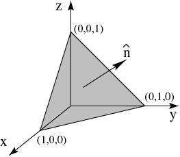 Use the cross product to find the components of the unit vector \(\mathbf{\boldsymbol{\hat n}}\) perpendicular to the plane shown in the figure below, i.e. the plane joining the points \(\{(1,0,0),(0,1,0),(0,0,1)\}\).