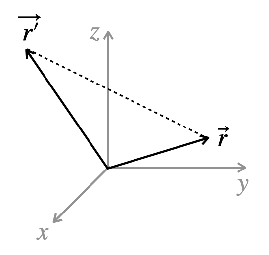 Find the distance \(\left\vert\vec r -\vec r\,{}'\right\vert\) between the point \(\vec r\) and the point \(\vec r'\) in rectangular coordinates.