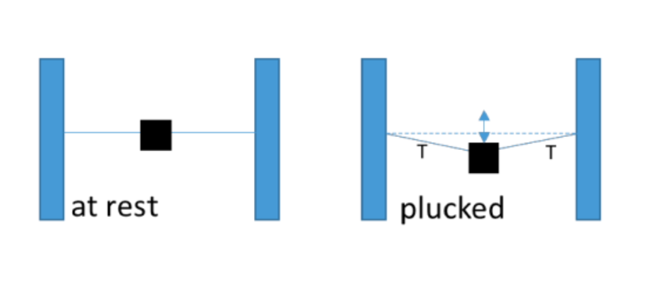 What is the resulting natural frequency \(\omega_0\) of the oscillating mass? Assume tension drives the oscillation (i.e. no gravity, if it helps pretend you are looking down at a mass resting on a frictionless surface) and assume the angle the string makes with the posts is small.