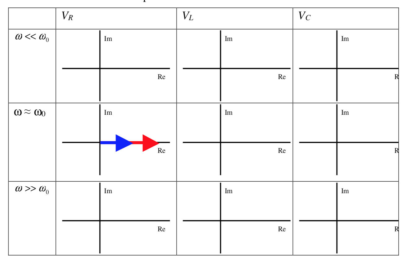 Draw phasor diagrams (i.e. on an Argand plot) representing the driving voltage at \(t=0\) and each of the voltages across teh capacitor \(V_C\), resistor \(V_R\), inductor \(V_L\) in a driven \(LRC\) circuit for three different cases: \((1) \,\omega << \omega_0\), \((2)\,\omega=\omega_0\) (resonance frequency), \((3)\,\omega>>\omega_0\). One phasor is filled in for you, with the red arrow representing the phase of the input voltage into the circuit and the blue arrow representing the phase of the voltage across the circuit component. Don't worry too much about the magnitudes of each arrow.