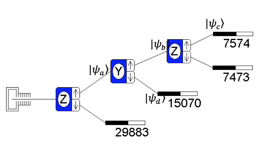 2. Spin One Half Unknowns (Brief) Using the SPINS simulation for a spin-\(\tfrac{1}{2}\) system (Spins simulation), for the unknown initial state \(\left|{\psi_4}\right\rangle \), perform measurements of \(S_x\), \(S_y\), and \(S_z\) separately, and for each measurement determine the probability of obtaining each possible measurement value.(We carried out the same procedure for \(\left|{\psi_3}\right\rangle \) in class; you may refer to that example.)