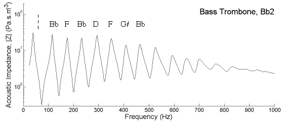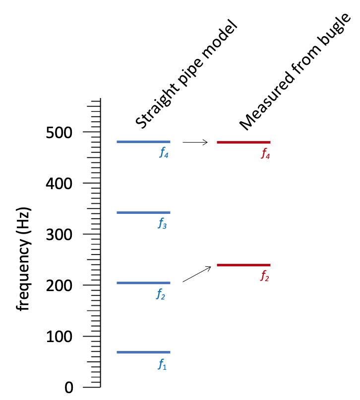 In summary, when we fit the model to the data using the \(f_4\) resonance, the \(f_2\) resonance does not fit. The measured \(f_2\) is higher than predicted by the straight-pipe model. How do I make sense of this? The information from Univ. of New South Wales says: "in the rapidly flaring bell, the long waves (with the low pitches) could be said to be 'least able to follow' the curve of the bell and so are effectively reflected earlier than are the shorter waves. (This is because their wavelengths are very much longer than the radius of curvature of the bell.) One might say therefore that the long waves 'see' an effectively shorter pipe."