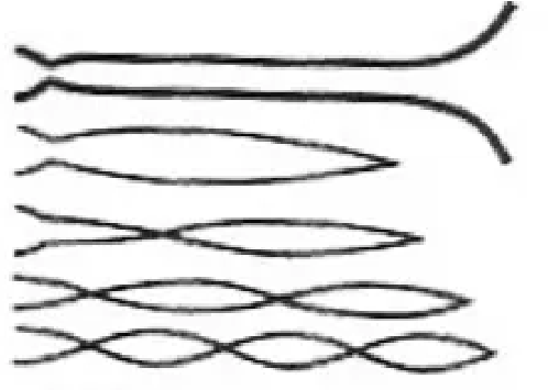 Examining the graphs above, the first resonance fits a quarter wavelength inside the bugle (\(\lambda _1/4 =L\)). The second resonance fits three "quarter wavelengths" inside the bugle. The third resonance fits five "quarter wavelengths" inside the bugle. The four resonance fits seven "quarter wavelengths" inside the bugle. Therefore, the wavelengths are \begin{align} \lambda _1 = 4L\\ \lambda _2 = 4L/3\\ \lambda _3 = 4L/5\\ \lambda _4 = 4L/7\\ \end{align} The corresponding frequencies (\(f=v / \lambda\)) are \begin{align} f_1=v/4L\\ f_2=3v/4L\\ f_3=5v/4L\\ f_4=7v/4L\\ \end{align}
