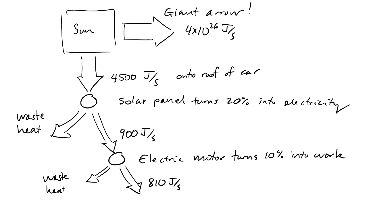 (a) Draw an energy flow diagram to describe the system. An arrow at the top of the flow diagram will represent incoming solar energy (landing on the solar panel). One circle will represent the solar panel, and one circle will represent the electric motor. Label each arrow with the correponding value of energy flow (a quantity measured in joules per second).