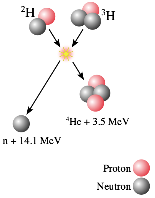From equipartition theorem (which we will study later), we expect each particle in a gas to have kinetic energy \begin{align} KE \approx (3/2)k_BT\\ \end{align} We are looking for a temperature where an average deuterium or tritium ion has \(KE \approx 7.1 \times 10^{-15} \text{ J}\). Therefore, \begin{align} T &= (2/3) \frac{[7.1 \times 10^{-15} \text{ J}]}{3k_B}\\ &= \frac{2 \cdot [7.1 \times 10^{-15} \text{ J}]}{3\cdot [1.38 \times 10^{-23} \text{ J/K}]}\\ &= 3.4\times 10^{8} \text{ K}\\ &= 340 \text{ million K} \end{align}