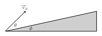 Problem: A ball is thrown into the air, but the ground below is not flat - it makes an angle \(\phi\) above the horizontal. The ball initially moves uphill with speed \(v_0\) at an angle \(\theta\) above the unlevel ground. Choose perpedicular axes with \(x\) measured directly up the slope of the ground, \(y\) normal to the ground, and \(z\) horizontal.
