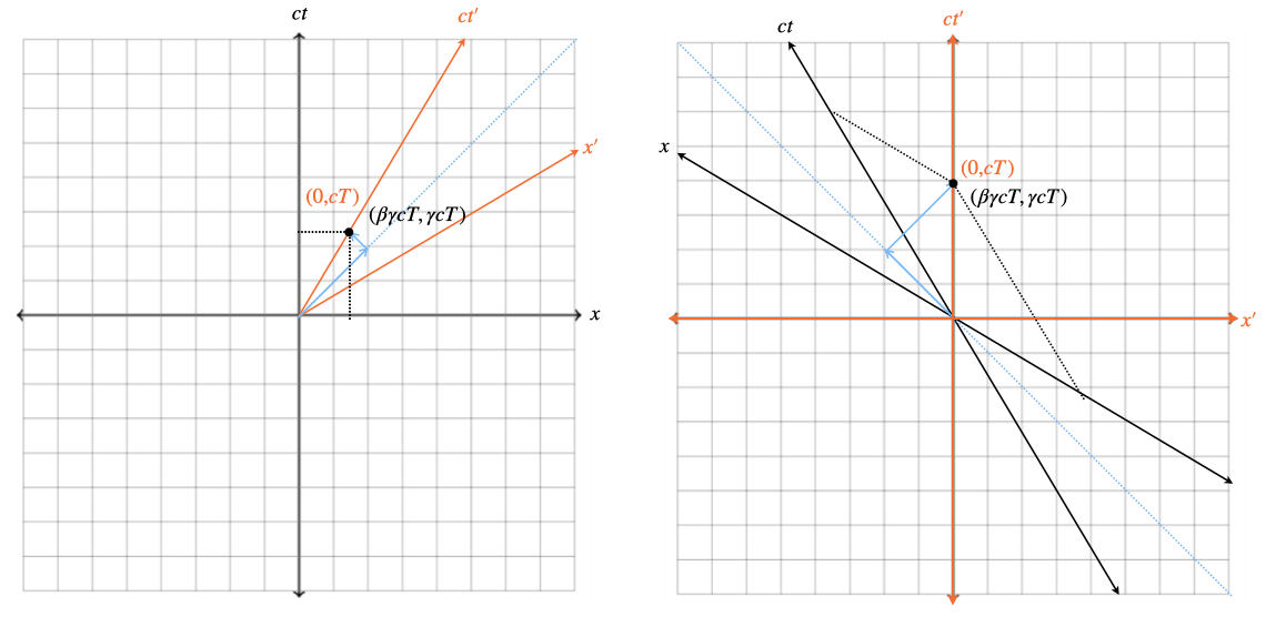 Similarly, if if I compare the time coordinates of the tick of my clock, I see the tick take \(cT\) while the other observer sees a longer time \(\gamma cT\). Since my clock is moving relative to the other observer, and they observe a longer time interval for the tick than I do, the other observer observes my clock running slow.