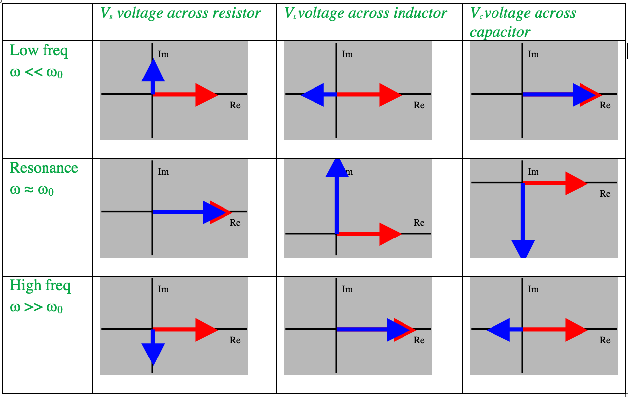A phasor is a representation of a complex number on the Argand plane. Below, the voltages are drawn as phasors at a particular time. A red phasor represents the applied voltage (along the real axis by convention) and the blue phasor is voltage across the relevant circuit element. These diagrams attempt to represent the absolute voltage magnitudes correctly e.g. at resonance, \(V_R = V_{ext}\), but the direction is emphasized here.