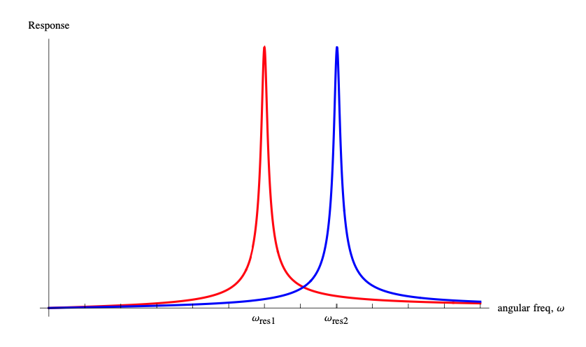 “resolvable” (see graph for qualitative idea). Then \(Q=\frac{f_0}{\Delta f}=500\) and \(\Delta f=\frac{f_0}{Q}=\frac{100\,MHz}{500}=0.2\,MHz\). The frequency spacing must be about \(200\,kHz\) and this would correspond to stations broadcasting at \(99.1\,MHz\), \(99.3\,MHz\), etc.. If you are tuned to the lower resonance frequency, you will pick up signals at frequencies higher too, but with lower amplitude. If another station is broadcasting at one of those higher frequencies, you'll pick that up too (at low amplitude), and it will interfere. You have to decide what constitutes acceptable interference. Of course, the higher the \(Q\) (i.e. the narrower the response curve), the more high and low frequencies the circuit will “reject”.