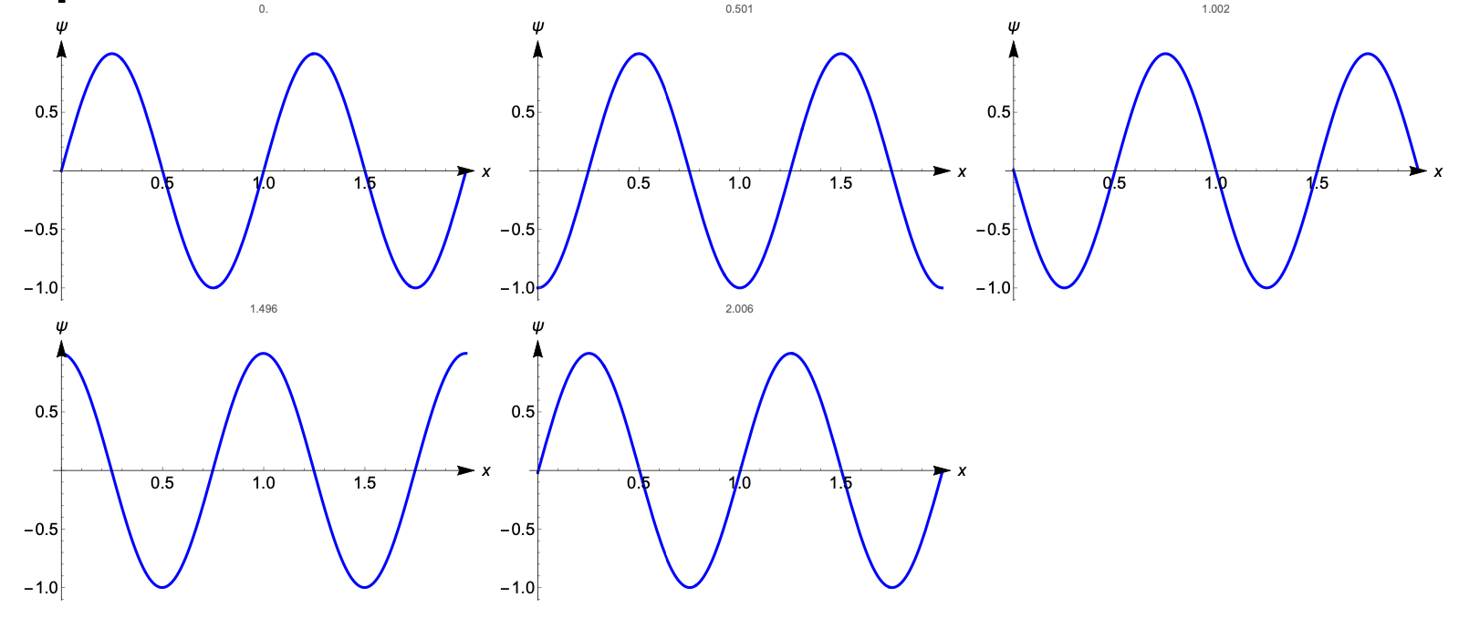 \[\psi(x,t)=\sum_k C_k\sin{(kx)}\cos{(\omega_k t)}\]