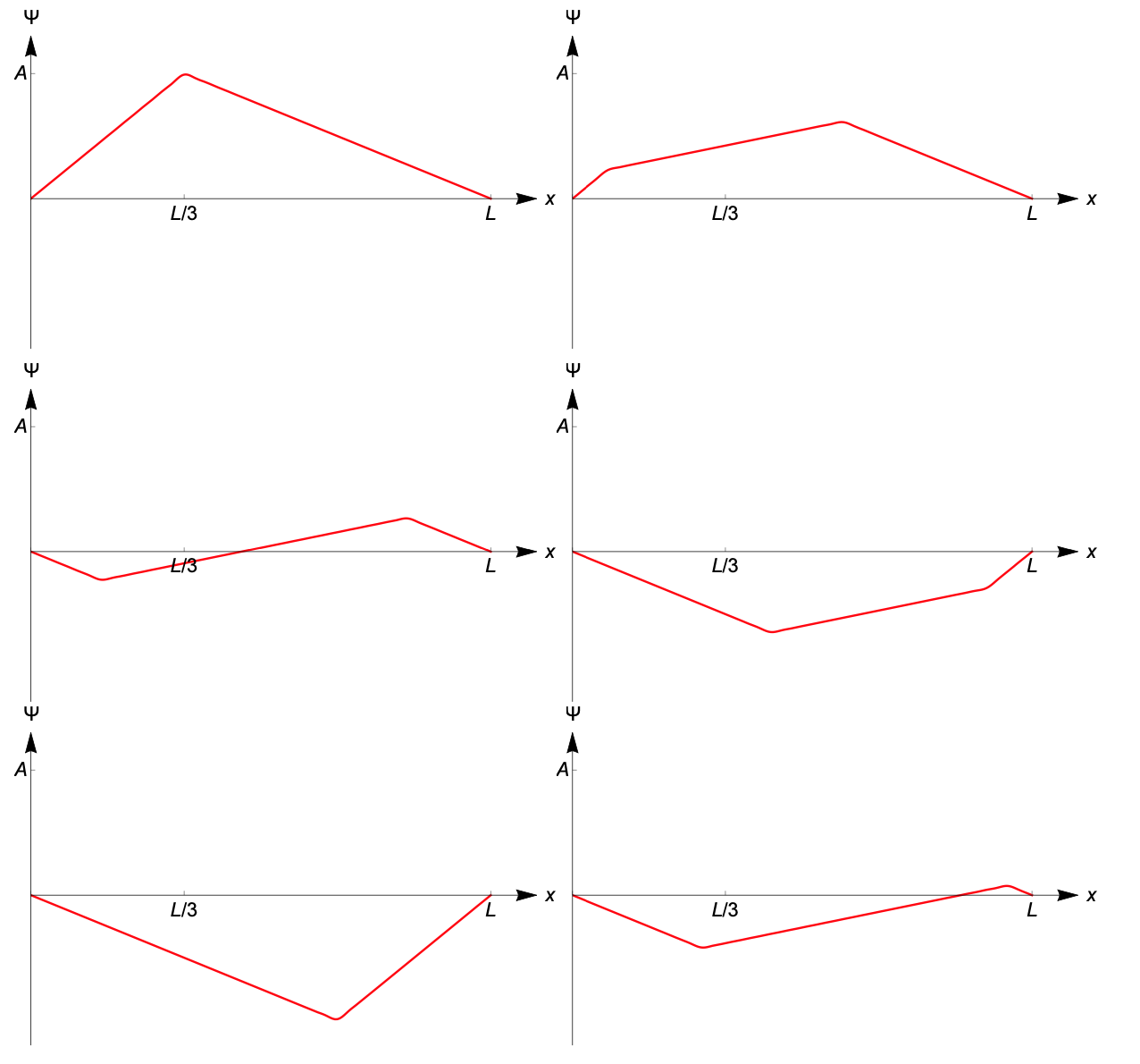Here are several stills of a complete cycle. You might think that the original shape should remain the same and it should just oscillate with an antinode at \(L/3\). But each component is multiplied by a cosine of different frequency, so the maxima don't always coincide. Instead, think of sine waves propagating at the same speed and they reconstitute the same shape after a time corresponding to the fundamental period.