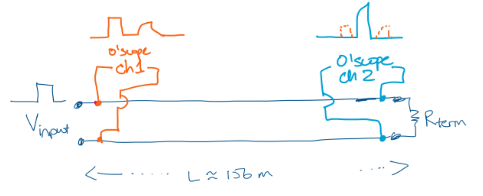 Figure: Circuit diagram of the coaxial cable, showing input pulse, terminating resistance (variable), and oscilloscope connections at both ends of the cable. The cable length is \(L\), about \(156\, m\).