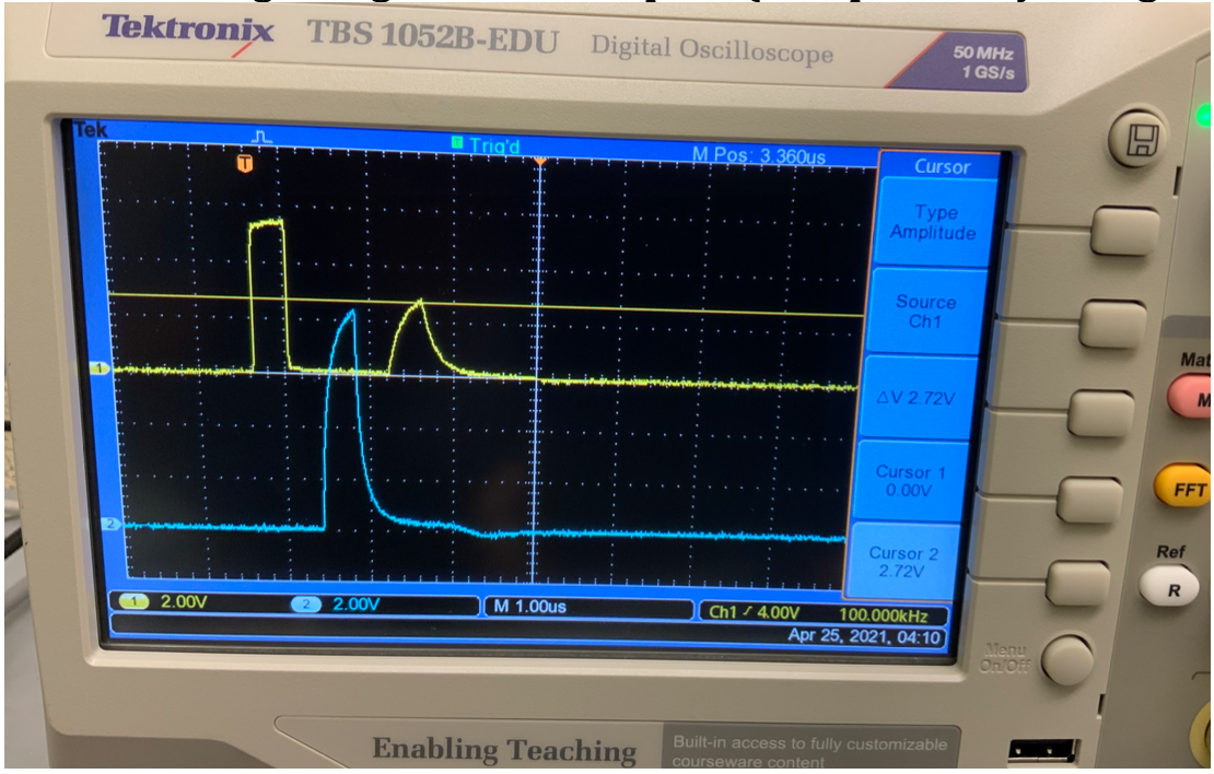 Yellow trace in above represents voltage at the input end, and blue trace at the opposite end. Note the pulse has traveled half the distance in half the time.
