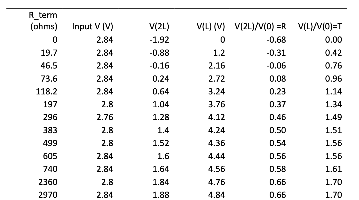 Table: Height of the voltage pulse applied (input), reflected (at \(2L\)) and transmitted (\(L\)) for each terminating resistance. The cable has length \(L\).