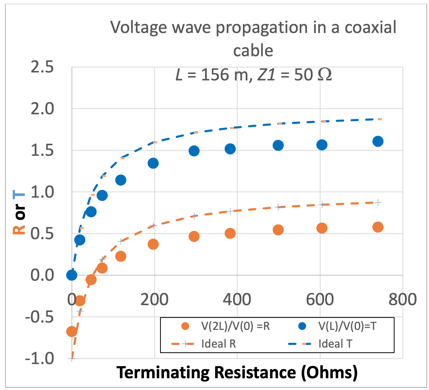 Now add to your data plot the results (use a line to indicate a model) expected from a model (i) in which resistance in the cable is neglected and (ii) resistance in the cable is incorporated and assumed to be relatively small compared to the impedance of the cable (“light damping”).