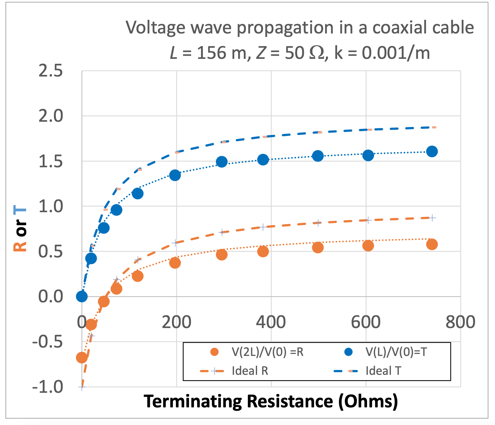 Add to the plot the model for the reflection and transmission coefficients derived in class, with \(k_2\rightarrow Z_2\) representing the varying terminating resistor (“impedance of cable \(2\)”) and \(k_1\rightarrow Z_1\), representing the fixed impedance of the coax cable to be determined from your data.
