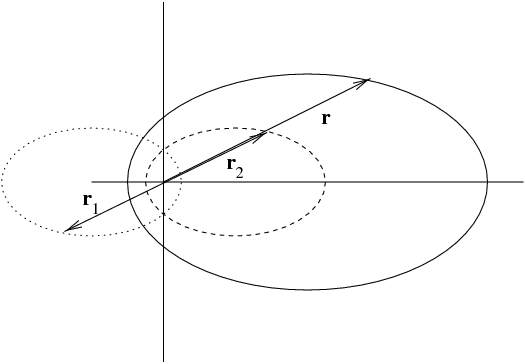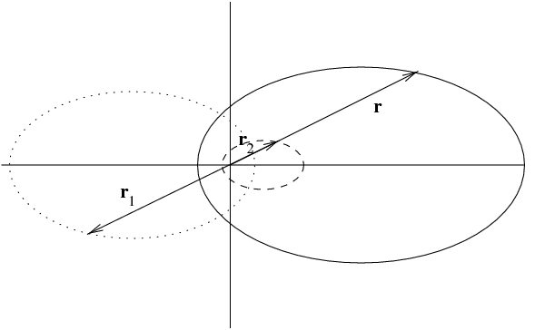 Notice that \(|{\vec r}|=|{\vec r}_1|+|{\vec r}_2|\) and that the orbits are reflections of each other through the origin. A common physics example would be motion of equal mass binary stars. A particle physics example would be positronium.