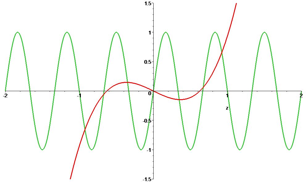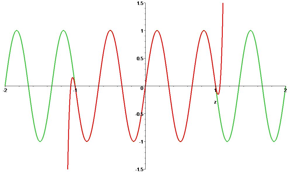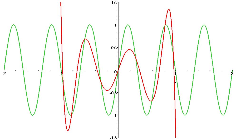 Use your favorite technology tool (e.g. Maple, Mathematica, Matlab, Python, pencil) to generate the Legendre polynomial expansion to the function \(f(z)=\sin(\pi z)\). How many terms do you need to include in a partial sum to get a “good” approximation to \(f(z)\) for \(-1<z<1\)? What do you mean by a “good” approximation? How about the interval \(-2<z<2\)? How good is your approximation? Discuss your answers. Answer the same set of questions for the function \(g(z)=\sin(3\pi z)\)