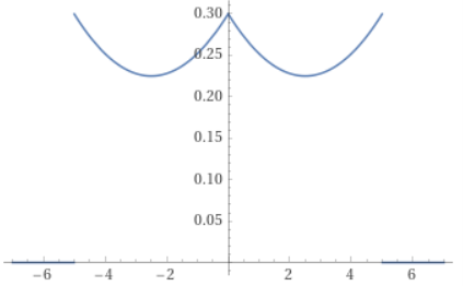 \begin{align*} |\psi(x)|^2 &= \begin{cases} \frac{3}{2b^3}|(b-|x|)|^2 & |x|<b \\ 0 & |x| > b\end{cases} \\ &= \begin{cases} \frac{3}{2b^3}(b^2+2bx+x^2) & -b<x<0 \\ \frac{3}{2b^3}(b^2-2bx+x^2) & 0<x<b \\ 0 & |x| > b\end{cases} \end{align*} Now we can plot this (\(b=5\)):